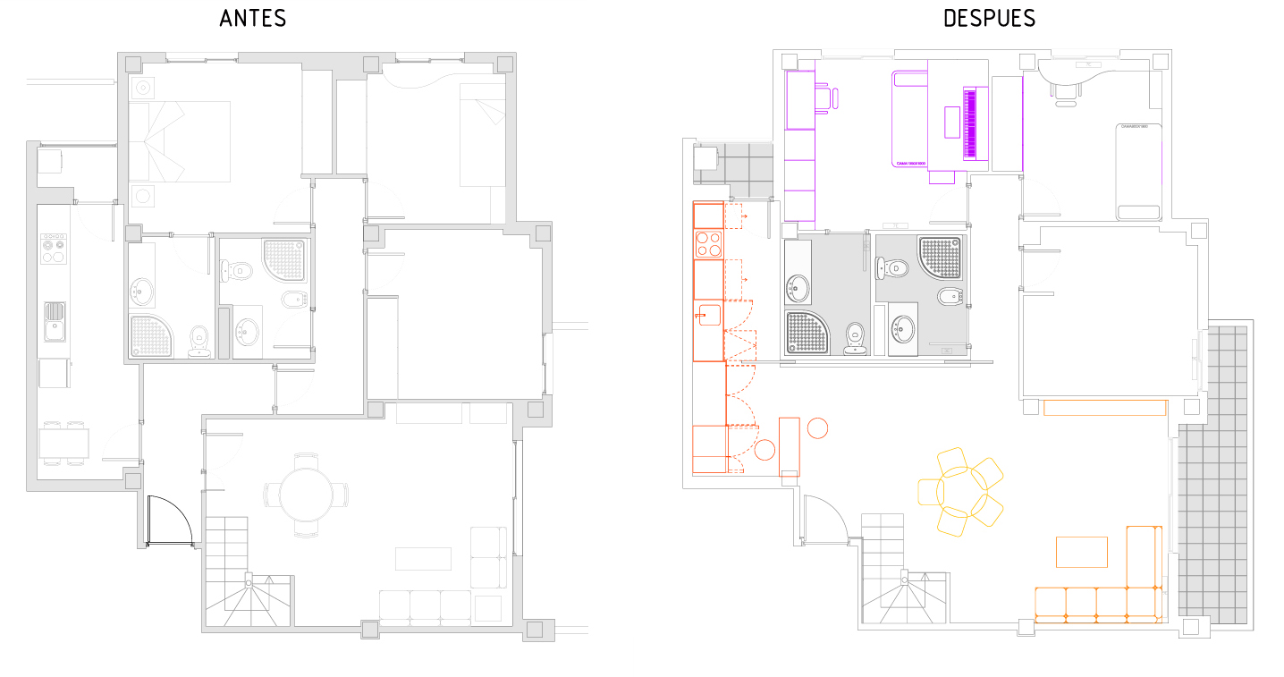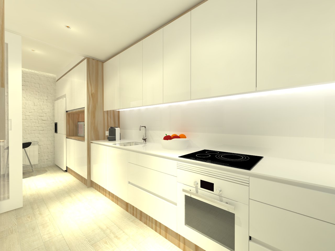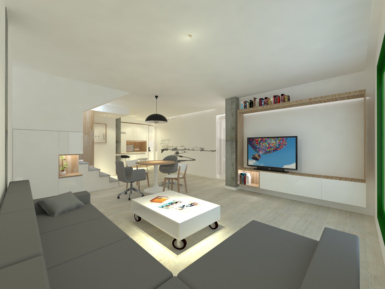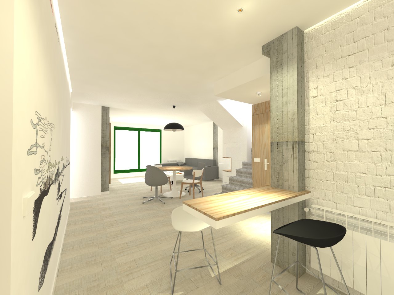 Se planteo un concepto abierto para conectar la cocina con el comedor. La cocina se divide en 2 partes, la parte sucia (fuegos y fregadero) y la parte «limpia» (frigorífico y office). Una puerta corredera oculta e independiza la parte sucia del resto… así cuando cocinas filetes empanados cierras la puerta y evitas olores.Se desnudaron los pilares de hormigón y una pared de ladrillo visto.Se diseñaron los muebles para la tv ,para un mueble bar, y se dispuso una barra que conecta la cocina con el comedor y lo separa visualmente con el hall.