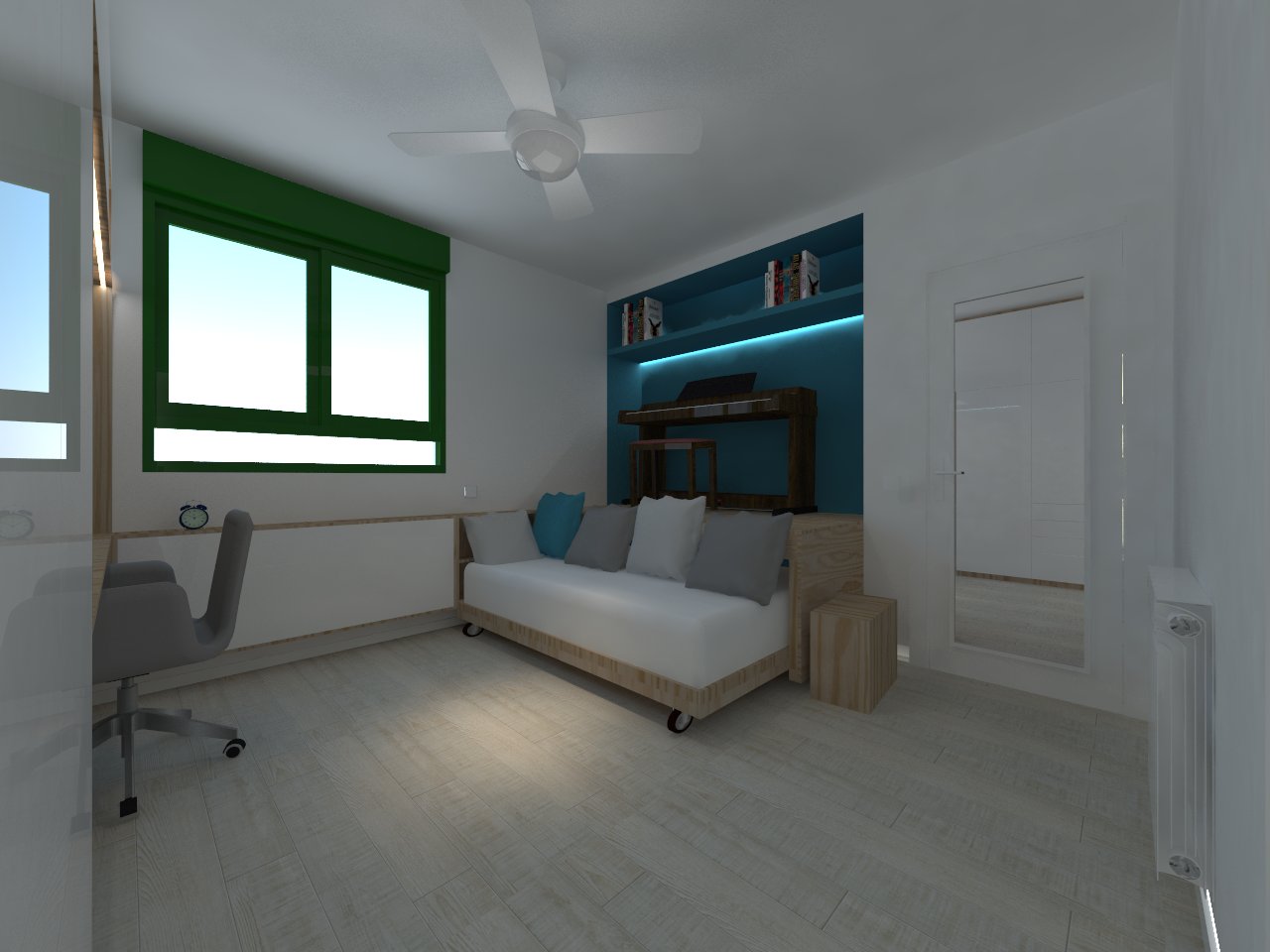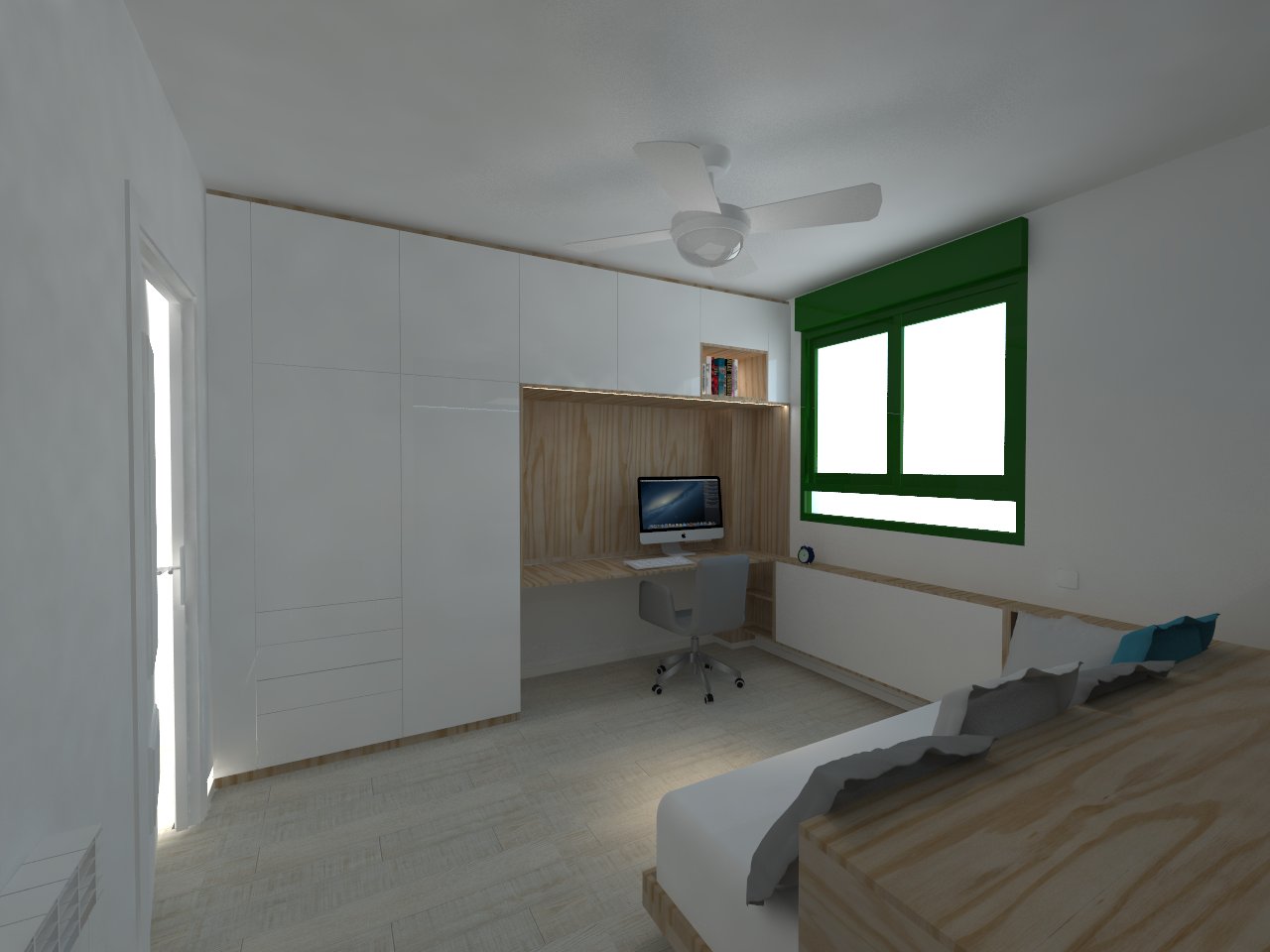 Un poco mas difícil fue solucionar el cuarto para María (la hija mayor). Ese año empezó la universidad y además de los usos normales de un dormitorio (cama, escritorio de estudio y por supuesto un gran armario vestidor) teníamos que disponer un piano eléctrico en el mismo cuarto. Se resolvió mediante la instalación de un altillo para disponer el piano y bajo el cual se esconde la cama, la cual sirve como sofá cuando se saca la mitad. En el frente del mueble se resolvió el escritorio y el vestidor.